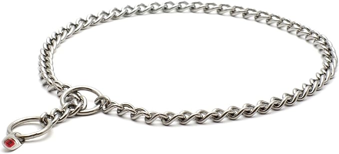 おもに金属でできた首輪で、犬が飼い主の動きに反して引っ張ると首がしまり、止まると緩みます